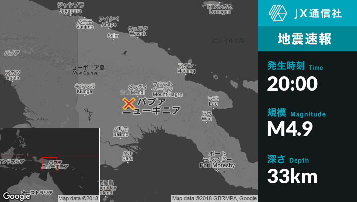 | 震源地 | パプアニューギニアのMendiから西南西48kmの地点 |
