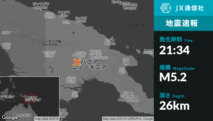 2月26日 21:34頃、パプアニューギニアのMendiから西南西37kmの地点でM5.2の地震がありました。