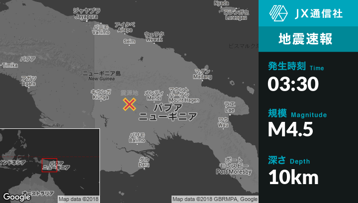 2月28日 03:30頃、パプアニューギニアのPorgeraから南西103kmの地点でM4.5の地震がありました。