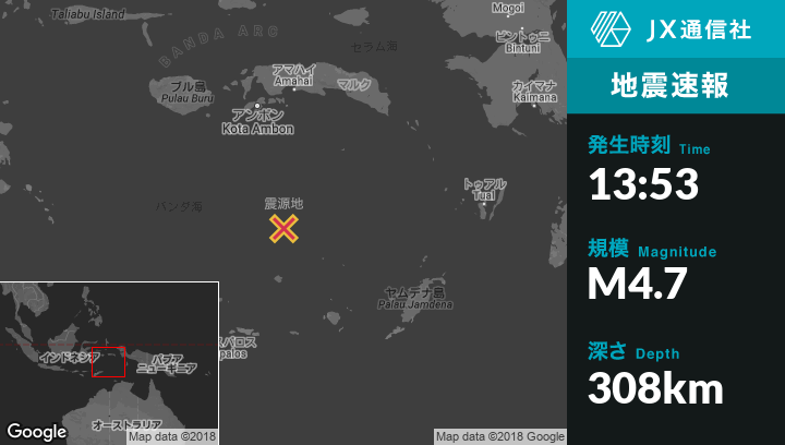 | 震源地 | インドネシアのAmahusuから南南東259kmの地点 |
