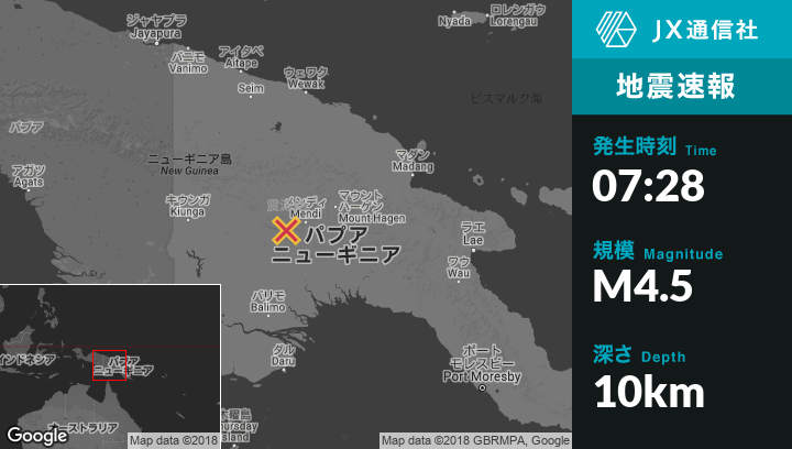 3月01日 07:28頃、パプアニューギニアのMendiから西43kmの地点でM4.5の地震がありました。
