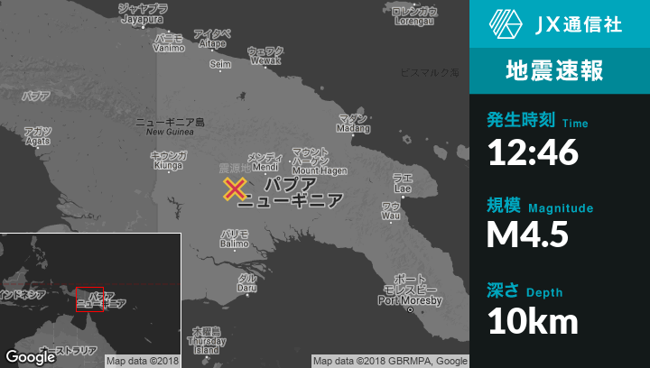 3月01日 12:46頃、パプアニューギニアのMendiから西南西85kmの地点でM4.5の地震がありました。