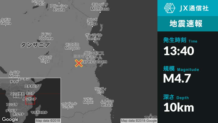 3月03日 13:40頃、タンザニアのKisangaから東南東50kmの地点でM4.7の地震がありました。