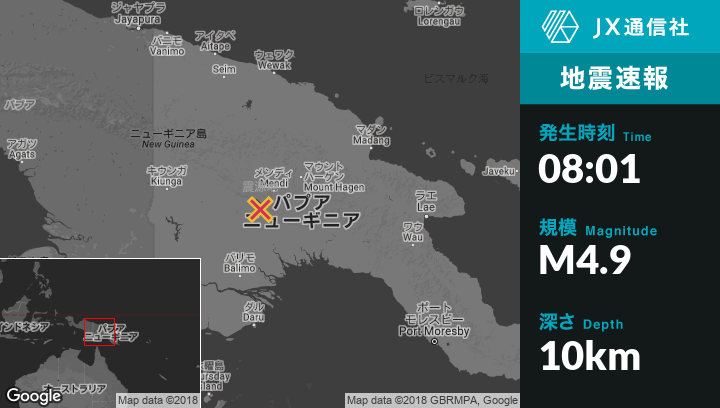 3月04日 08:01頃、パプアニューギニアのMendiから南西44kmの地点でM4.9の地震がありました。