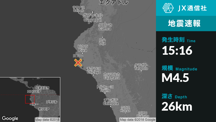 3月04日 15:16頃、ペルーのSechuraから南西27kmの地点でM4.5の地震がありました。