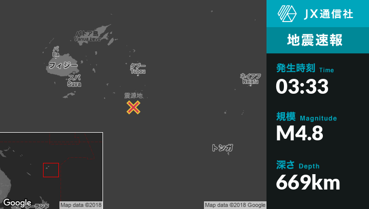 3月06日 03:33頃、フィジーのNdoi Islandから北北西141kmの地点でM4.8の地震がありました。