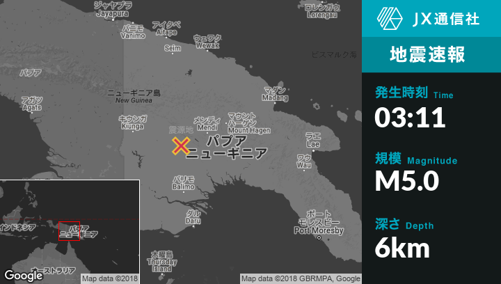 | 震源地 | パプアニューギニアのMendiから西南西97kmの地点 |