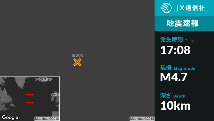 4月05日 17:08頃、グリーンランドのNanortalikから南東961kmの地点でM4.7の地震がありました。