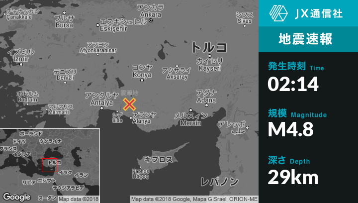 4月14日 02:14頃、トルコのAksekiから北東15kmの地点でM4.8の地震がありました。