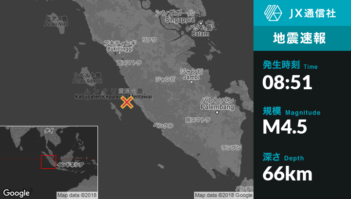 | 震源地 | インドネシアのSungaipenuhから西南西82kmの地点 |