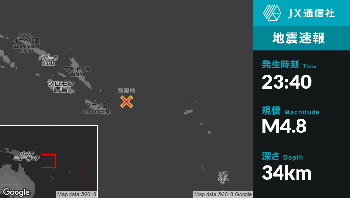 4月17日 23:40頃、ソロモン諸島のKirakiraから東北東137kmの地点でM4.8の地震がありました。