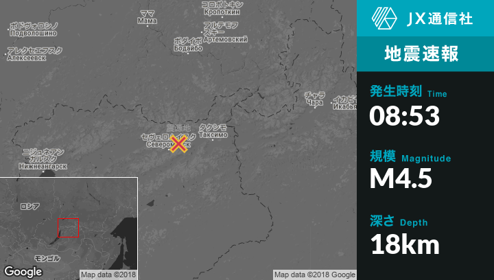 4月18日 08:53頃、ロシアのSeveromuyskから北東35kmの地点でM4.5の地震がありました。