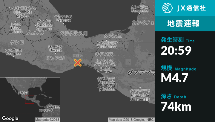 4月18日 20:59頃、メキシコのSan Jeronimo Ixtepecから南5kmの地点でM4.7の地震がありました。