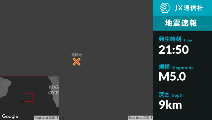 4月18日 21:50頃、セントヘレナのJamestownから南西1267kmの地点でM5.0の地震がありました。