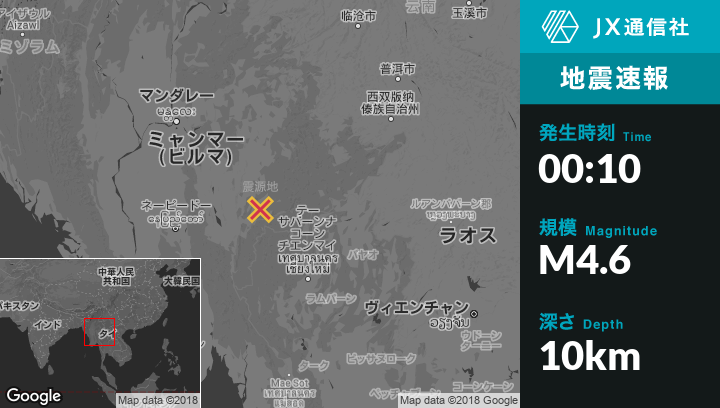 7月02日 00:10頃、タイのSop Pongから北北西89kmの地点でM4.6の地震がありました。