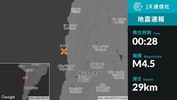 7月02日 00:28頃、チリのIllapelから西北西66kmの地点でM4.5の地震がありました。