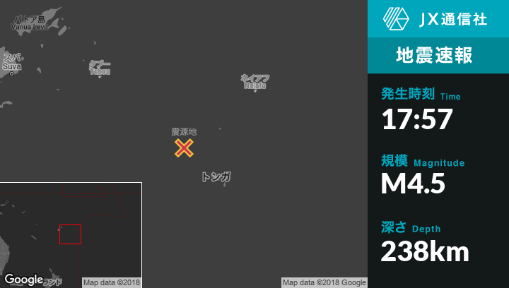 7月04日 17:57頃、トンガのNuku`alofaから北西146kmの地点でM4.5の地震がありました。