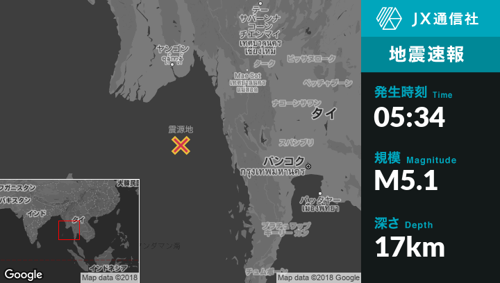 7月05日 05:34頃、ミャンマーのDaweiから西北西193kmの地点でM5.1の地震がありました。