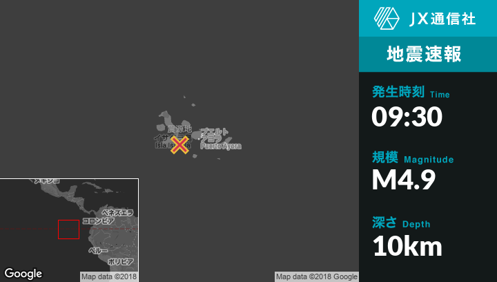 7月05日 09:30頃、エクアドルのPuerto Villamilから北北東16kmの地点でM4.9の地震がありました。