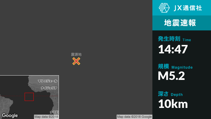 7月11日 14:47頃、セントヘレナのGeorgetownから北718kmの地点でM5.2の地震がありました。
