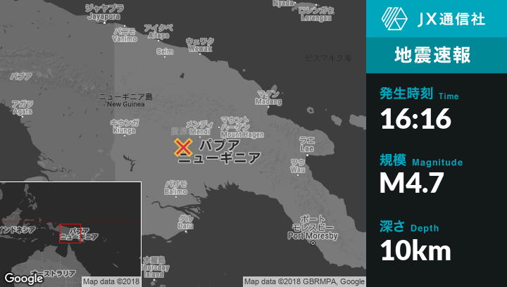 7月16日 16:16頃、パプアニューギニアのMendiから西南西61kmの地点でM4.7の地震がありました。