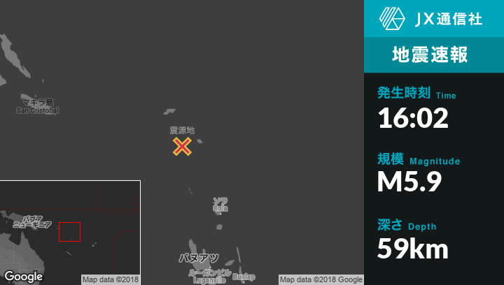 7月17日 16:02頃、ソロモン諸島のLataから南南東120kmの地点でM5.9の地震がありました。