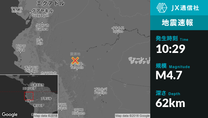 7月18日 10:29頃、ペルーのYurimaguasから西北西53kmの地点でM4.7の地震がありました。