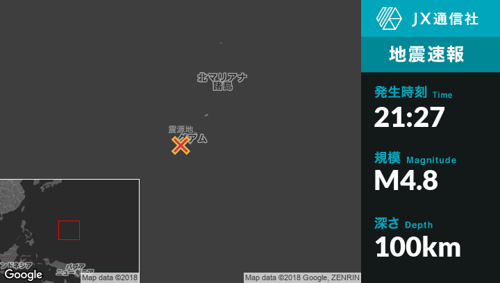 7月18日 21:27頃、グアムのAgat Villageから西27kmの地点でM4.8の地震がありました。