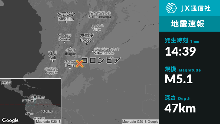| 震源地 | コロンビアのColombiaから東21kmの地点 |