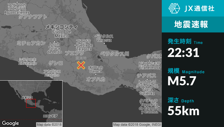 | 震源地 | メキシコのHuajuapan de Leonから北西1kmの地点 |