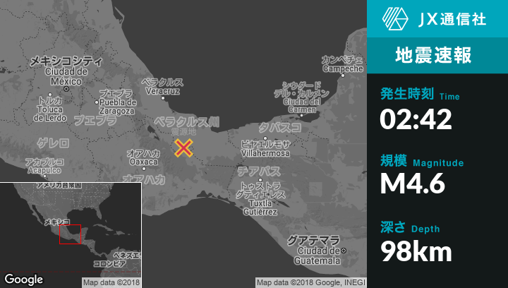 7月21日 02:42頃、メキシコのJuan Rodriguez Claraから南南西20kmの地点でM4.6の地震がありました。
