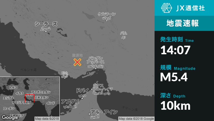 7月22日 14:07頃、イランのLarから東55kmの地点でM5.4の地震がありました。