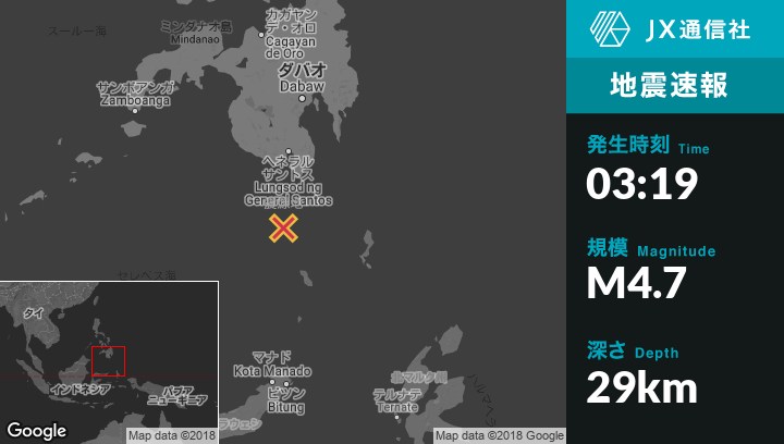 | 震源地 | フィリピンのSaranganiから南南西89kmの地点 |