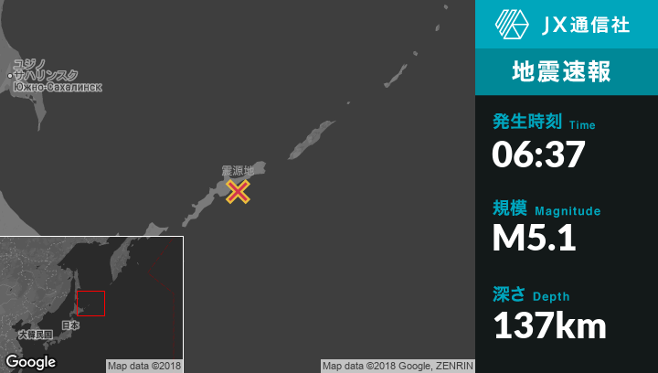7月24日 06:37頃、ロシアのKuril'skから東南東27kmの地点でM5.1の地震がありました。