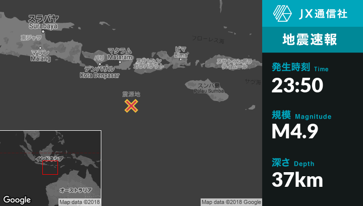 7月24日 23:50頃、インドネシアのKuteから南南東163kmの地点でM4.9の地震がありました。