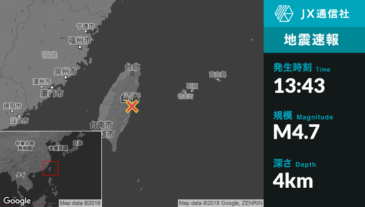 9月11日 13:43頃、台湾のHualianから南南西16kmの地点でM4.7の地震がありました。