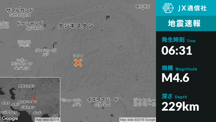9月14日 06:31頃、アフガニスタンのAshkashamから南西34kmの地点でM4.6の地震がありました。