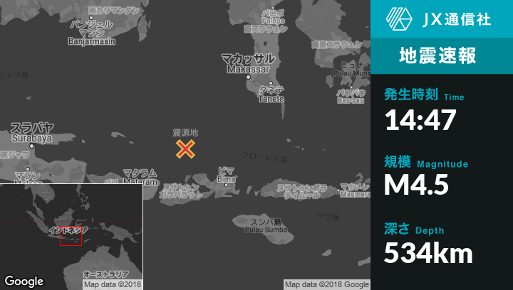 9月17日 14:47頃、インドネシアのLabuhankanangaから北北西104kmの地点でM4.5の地震がありました。