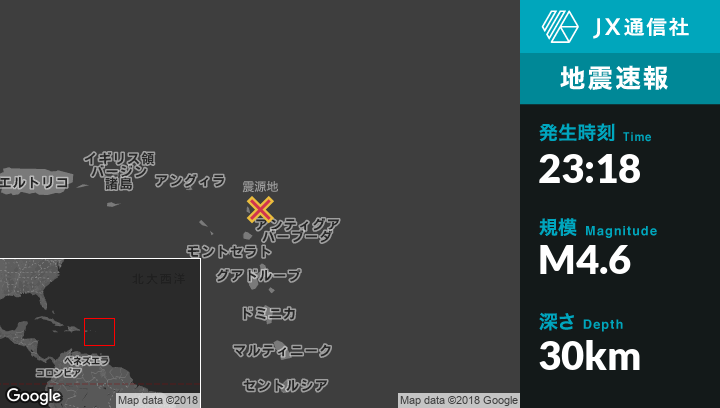 9月26日 23:18頃、バーブーダのCodringtonから東北東33kmの地点でM4.6の地震がありました。