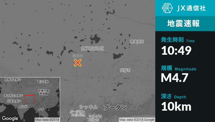 | 震源地 | 中国のJiajuedibuから西南西108kmの地点 |
