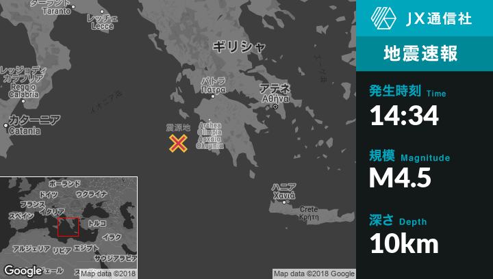 11月01日 14:34頃、ギリシャのLithakiaから南南西66kmの地点でM4.5の地震がありました。