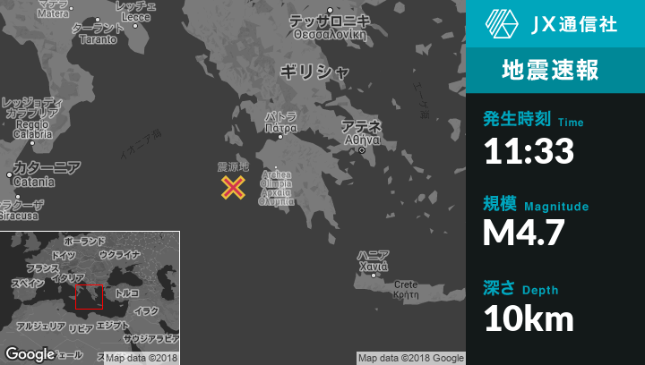 11月02日 11:33頃、ギリシャのLithakiaから南南西46kmの地点でM4.7の地震がありました。