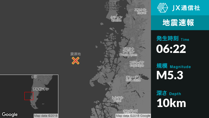11月07日 06:22頃、チリのPuerto Chacabucoから西303kmの地点でM5.3の地震がありました。