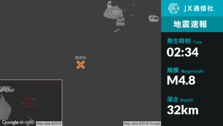 12月13日 02:34頃、フィジーのCeva-i-Raから東北東124kmの地点でM4.8の地震がありました。