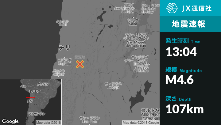 12月13日 13:04頃、チリのCopiapoから東南東114kmの地点でM4.6の地震がありました。