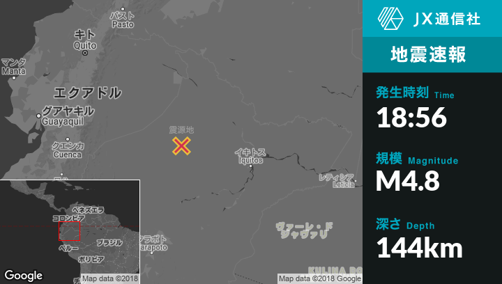 12月14日 18:56頃、ペルーのBarrancaから北東247kmの地点でM4.8の地震がありました。