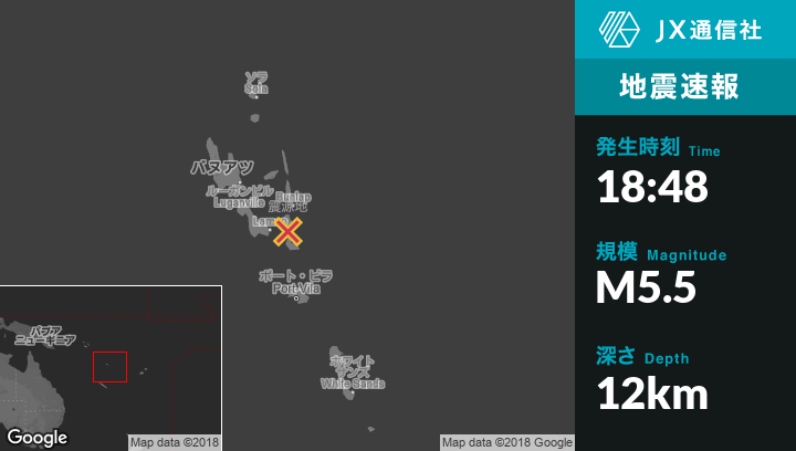 12月16日 18:48頃、バヌアツのLakatoroから東南東83kmの地点でM5.5の地震がありました。