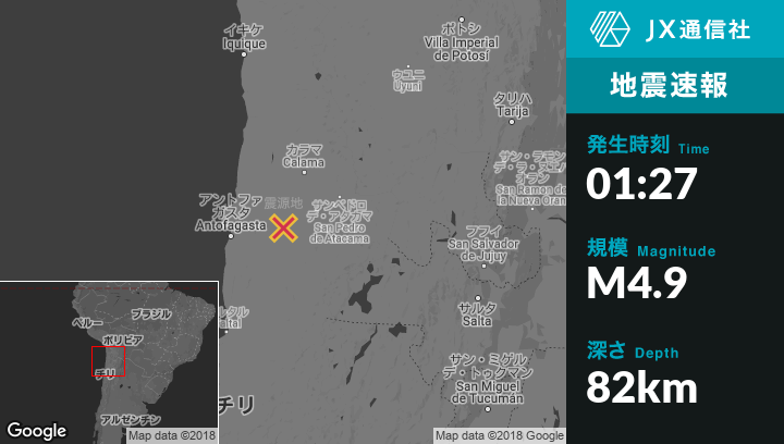 | 震源地 | チリのCalamaから南南西109kmの地点 |