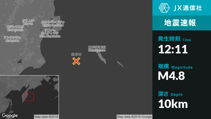 12月21日 12:11頃、ロシアのNikol'skoyeから西南西104kmの地点でM4.8の地震がありました。