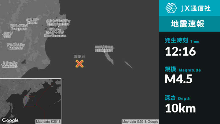 12月22日 12:16頃、ロシアのNikol'skoyeから西南西121kmの地点でM4.5の地震がありました。